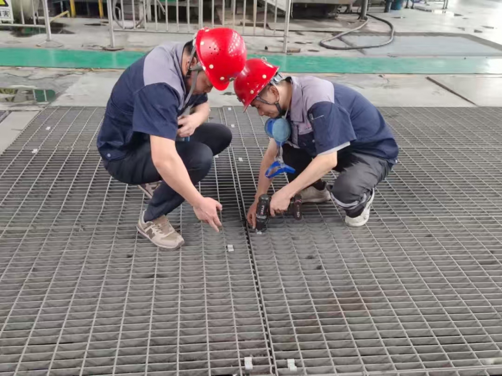 突出問(wèn)題精準(zhǔn)治理。一選廠已生產(chǎn)運(yùn)行多年,濃密車間人行通道地板腐蝕嚴(yán)重,數(shù)次進(jìn)行修修補(bǔ)補(bǔ),存在較大安全隱患。為徹底解除隱患,公司利用停機(jī)間隙,籌集資金、人力、物資,對(duì)70米通道的地板、護(hù)欄、橫梁和支柱進(jìn)行全面拆除更換,有效保障了作業(yè)區(qū)域安全;同時(shí),為汲取內(nèi)蒙古“7.23”格柵板脫落事故的教訓(xùn),切實(shí)保障員工及參觀人員的生命安全,公司購(gòu)買8000套固定卡扣,對(duì)兩個(gè)選廠磨浮車間格柵板進(jìn)行加固處理,并在參觀通道設(shè)立了安全提示牌。